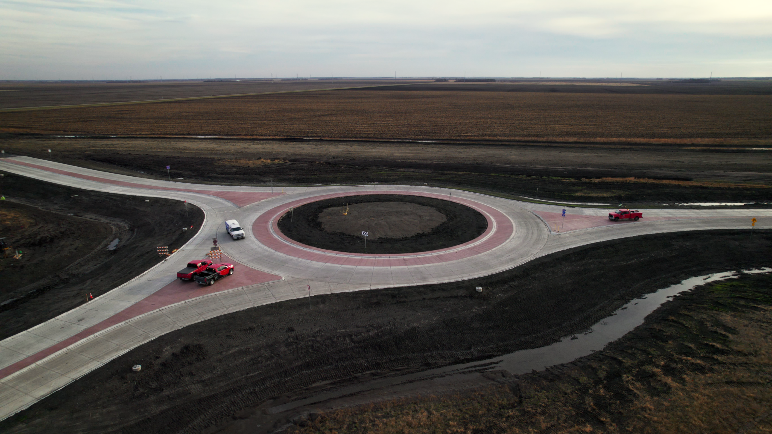 The project included constructing a roundabout intersection, T intersection and an embankment. These features consisted of about 6,000 cubic yards of reinforced concrete, 30,000 cubic yards of asphalt pavement and 680 feet of culverts. Landscaping, embankment and other additional permanent features will be completed in the spring of 2026.
