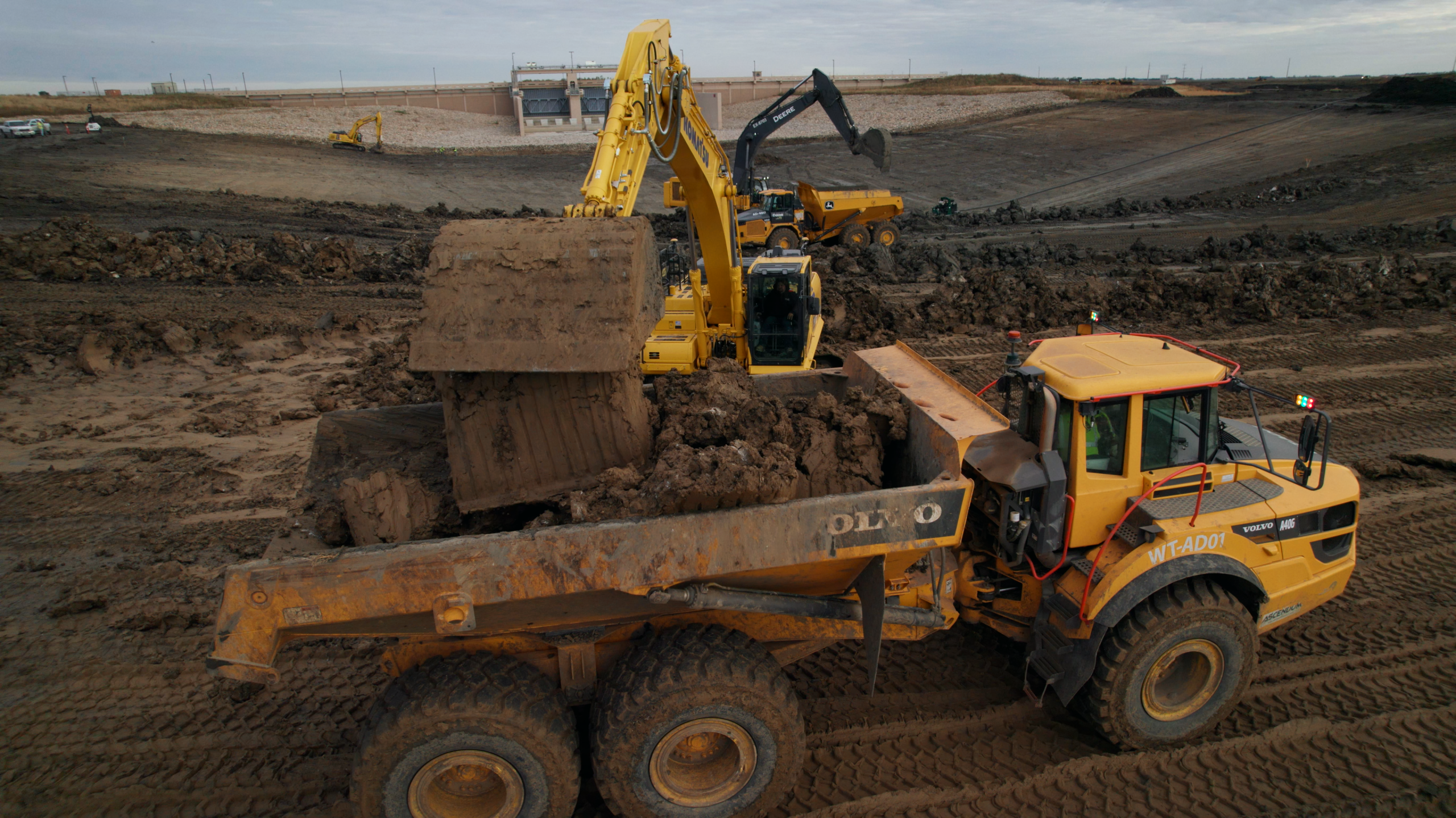 FARGO, ND (November 21, 2025) – Some work on the FM Area Diversion project is wrapping up for the season, but other sites will continue 24/7 through the winter. Reaches of the 22-mile southern embankment are among the components winding down. Much of the necessary 9.4 million cubic yards of material that needs to be excavated for the embankment has been moved. For perspective, that’s enough to reconstruct the Great Pyramid of Giza three more times.